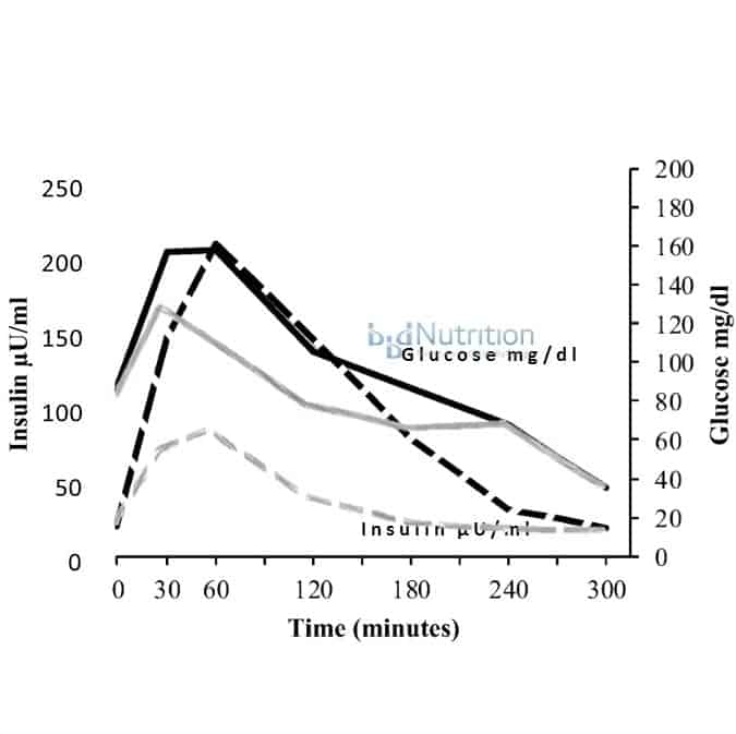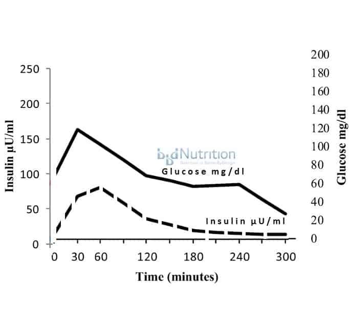 The rest of the insulin stored in β-cells is only released when blood sugar rises after the person eats foods containing carbohydrate. This insulin is released in two phases [1]. The first-phase insulin response occurs as soon as the person begins to eat and peaks within 30 minutes and can be seen at 30 minutes on the graph above.