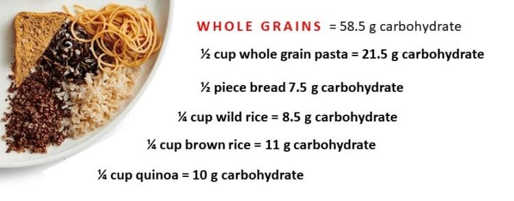1 1/2 cups of whole grain pasta…and this amount of pasta without sauce has 45 g of carbohydrate in it — which is still less than the 53 g of carbs illustrated in the Canada Food Guide sample plate. Naturally, no one is expected to eat exactly like the “sample meal”, but whether one eats their “whole grains” as all brown rice, wild rice, Bulgar wheat or something else, 1/4 of the plate all have the same amount of carbohydrate per 1/2 cup serving as pasta.