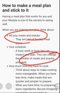 Yes, snacks are mentioned TWICE on the first page under the link for “eating habits” in the section on “how to make a meal plan and stick to it”;